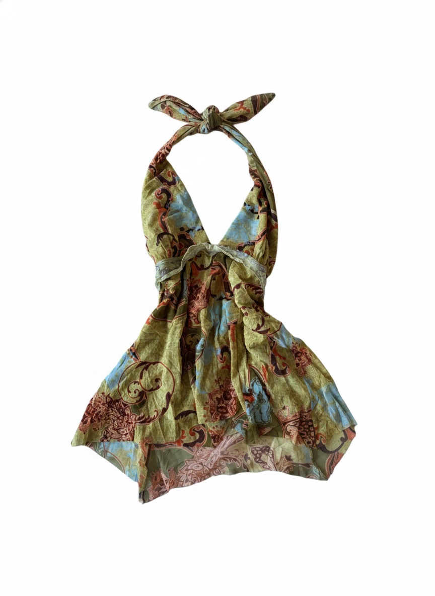 Giving major Y2K-meets-boho-goddess energy, this handkerchief halter top is the definition of a summer mood. With its earthy paisley print and that perfectly playful tie-back, it’s practically begging to be worn to a beach club or your next outdoor festival. Pair it with low-rise flares or denim cut-offs for a look that’s effortless, spunky, and totally unique.