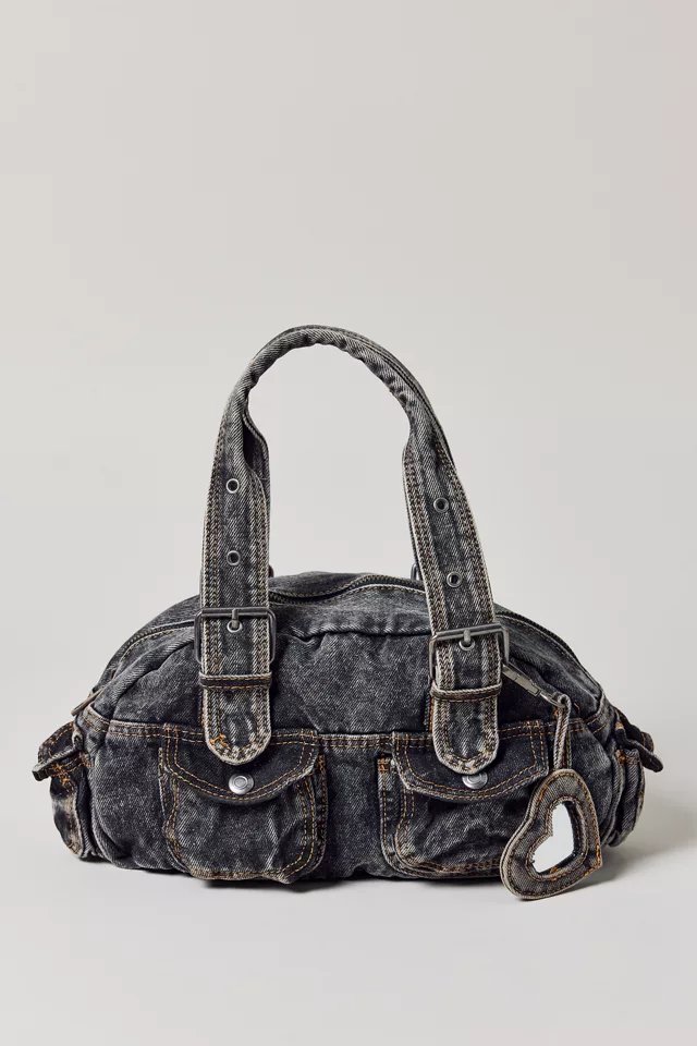 Essential denim bag from BDG with Y2K styling. Mini duffle style with a zippered top and snapped pouch pockets. Trimmed with a hear-shaped mirror charm and finished with a removable crossbody strap. Sold out at Urban Outfitters so now only found at clementine's bedroom (; Features - Denim 2000s bag from BDG in a mini silhouette - Zipper closure with a removable adjustable crossbody strap
